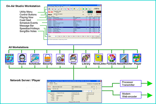 Easy to use software for radio broadcasters to build audio libraries, design formats, compile playlists, create schedules, print reports and control broadcast output. Features over a dozen multi-user applications which open on any workstation. Create exciting music formats and record, edit, audition and play from any workstation. You can programme and operate the radio station by yourself, or allow the whole team to work together as one. Automatically generate time relevant schedules, with a fresh music mix, for every day.