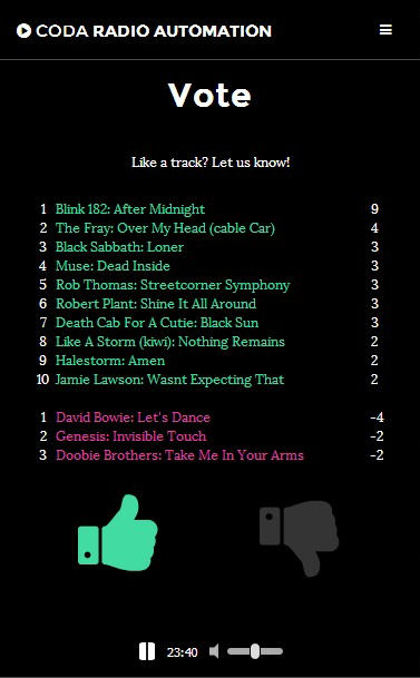 Synchronise your playing details with your website or mobile device, and update details automatically as each event plays. Publish the current Title/Artist details, plus Album Art, About Artist liner notes, Last Played lists and Top Tracks hit list. Let your listeners Vote for songs, and register their Likes on Facebook and other social media.